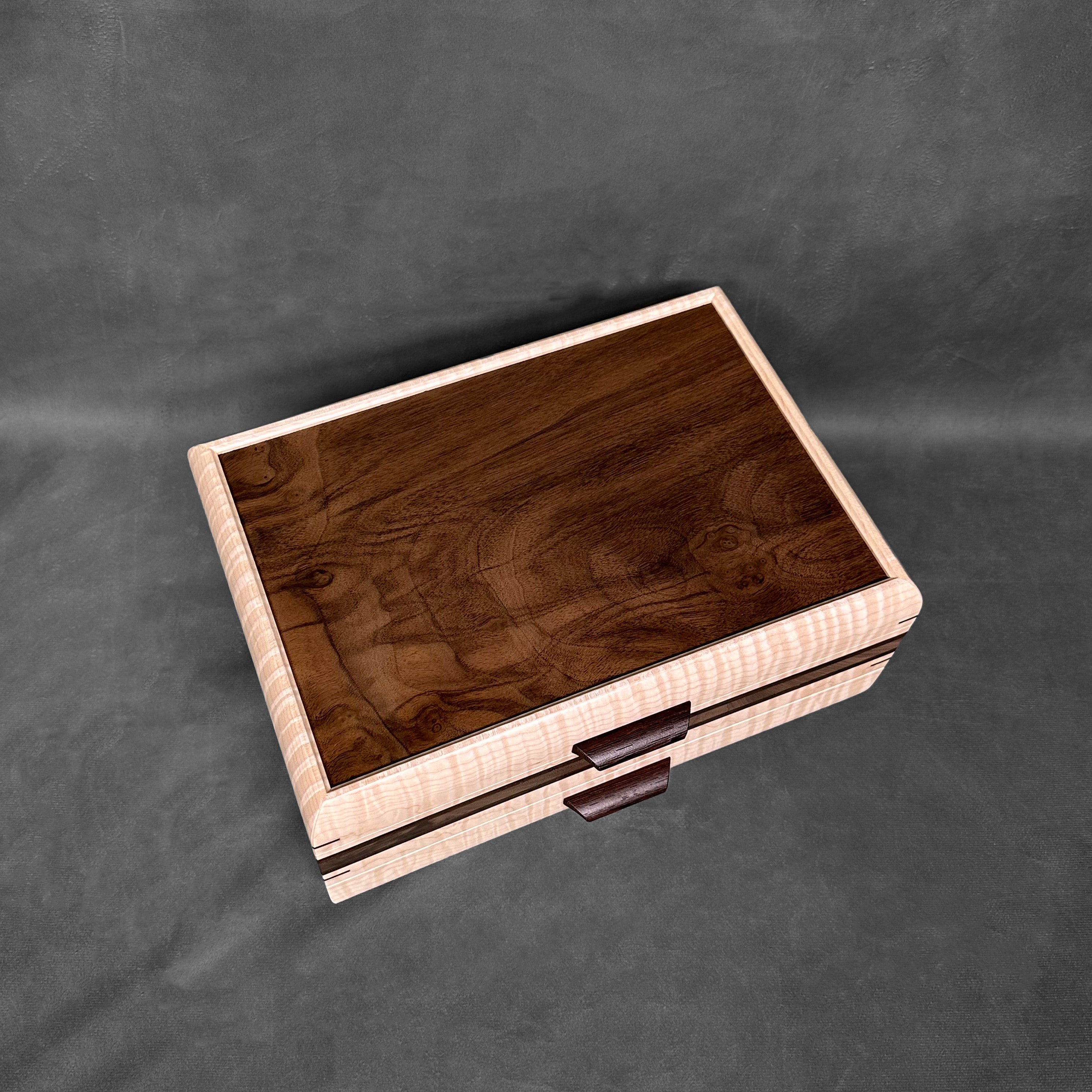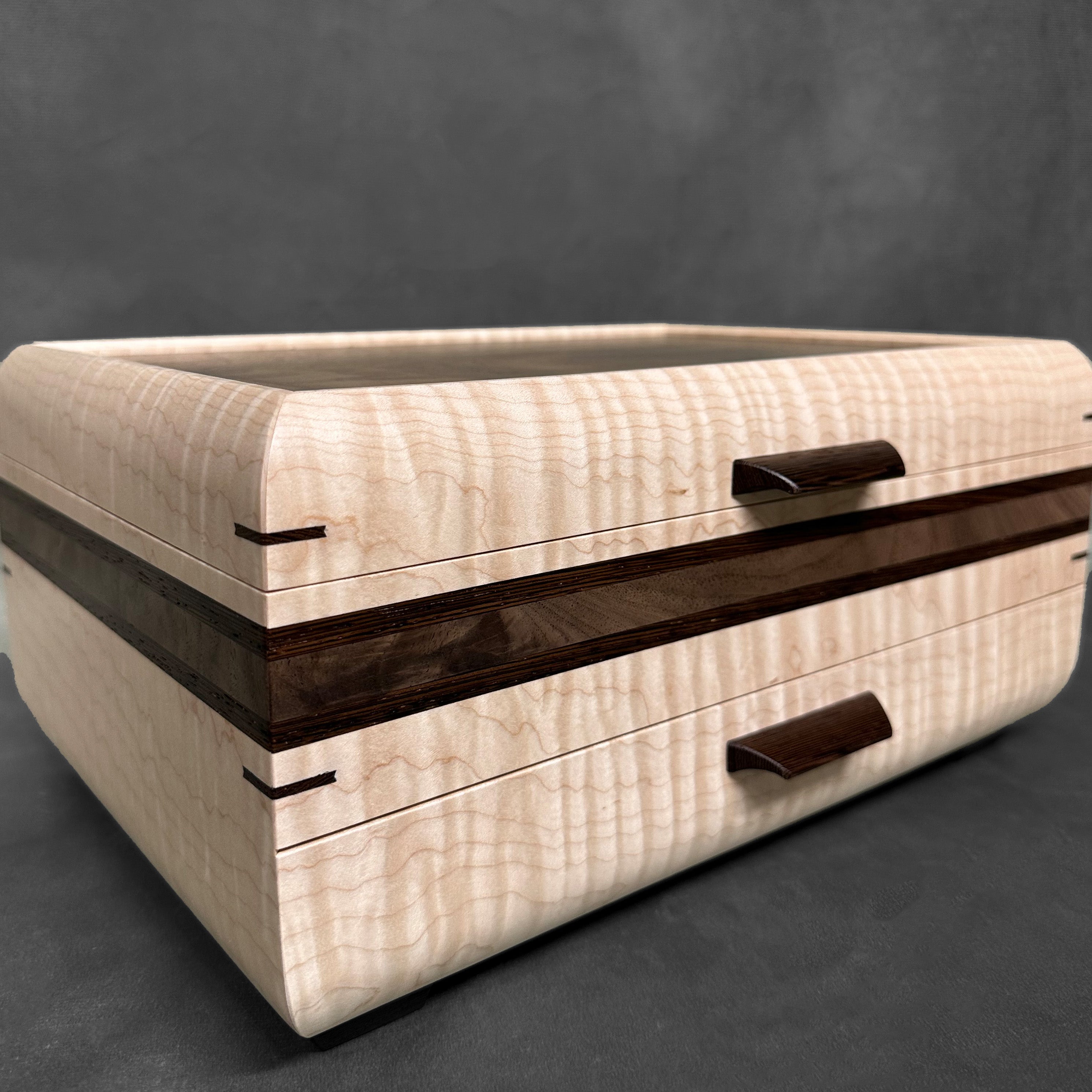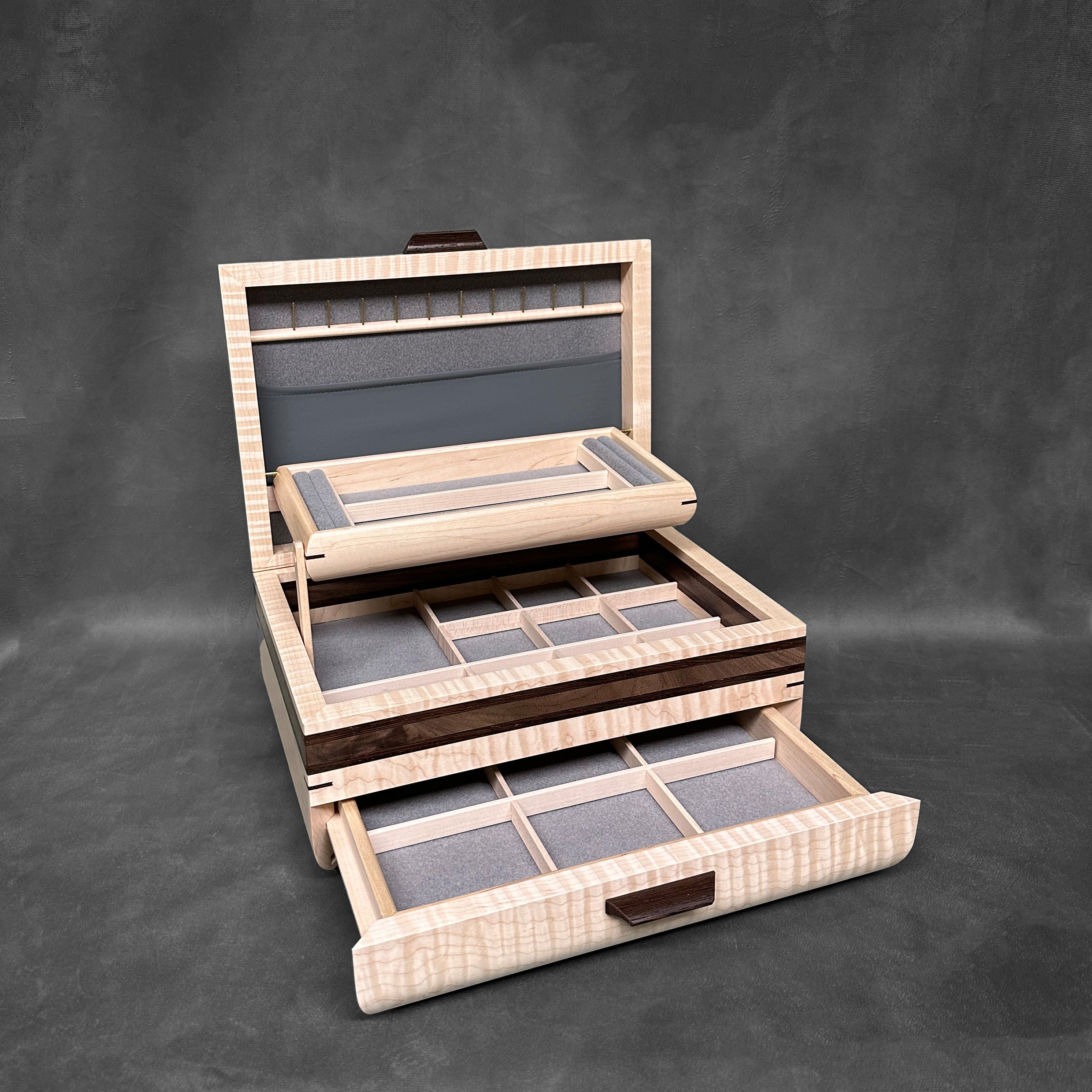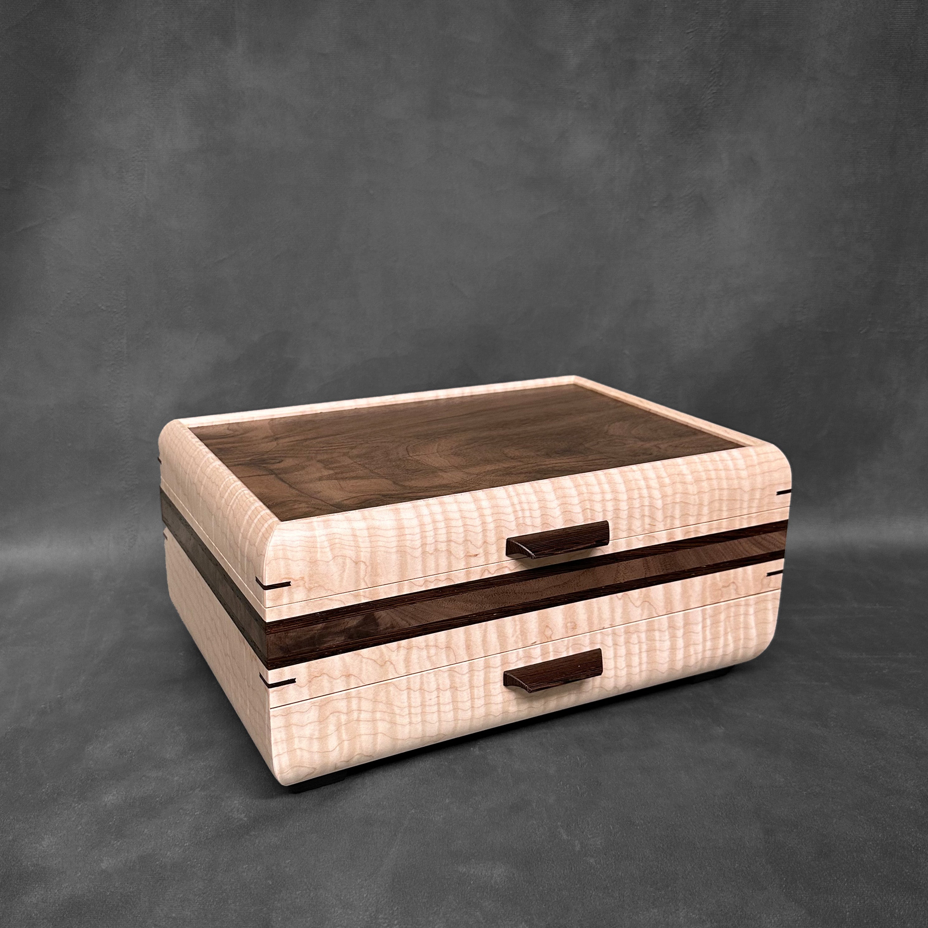 With its exquisite combination of Curly Maple and swirled Walnut lid, this jewelry chest is a luxurious addition to your home. The additional artistic, hand laminated striping throughout the box is made with Wenge, Walnut and Bubinga. Handles, feet and splines are made with Wenge. Not only does it provide ample storage space for your precious jewelry, but it also serves as a stunning decorative piece. Imagine admiring its intricate design and rich colors every day, a reminder of your impeccable taste and appreciation for quality craftsmanship. Elevate your jewelry collection with our SELECT Sophisticated Jewelry Chest and add a touch of elegance to your living space.