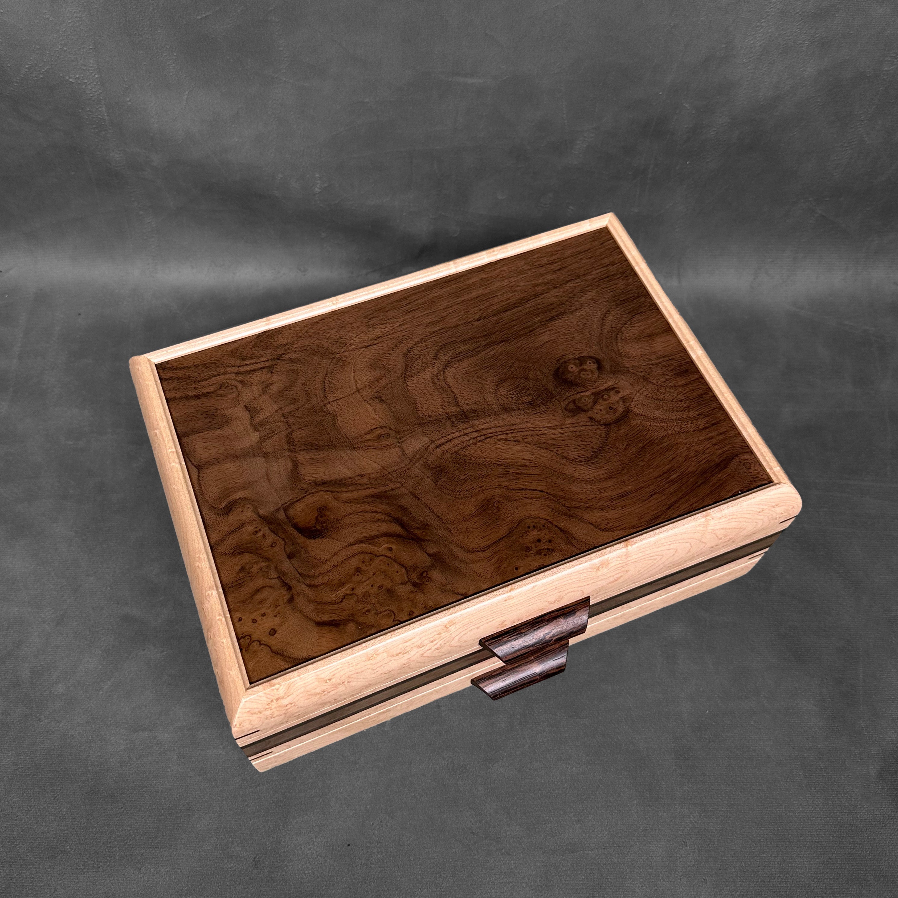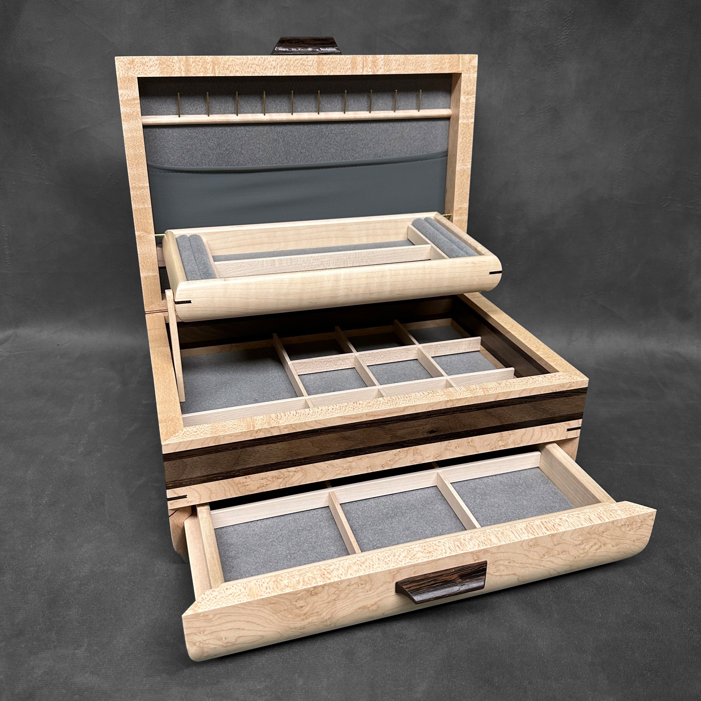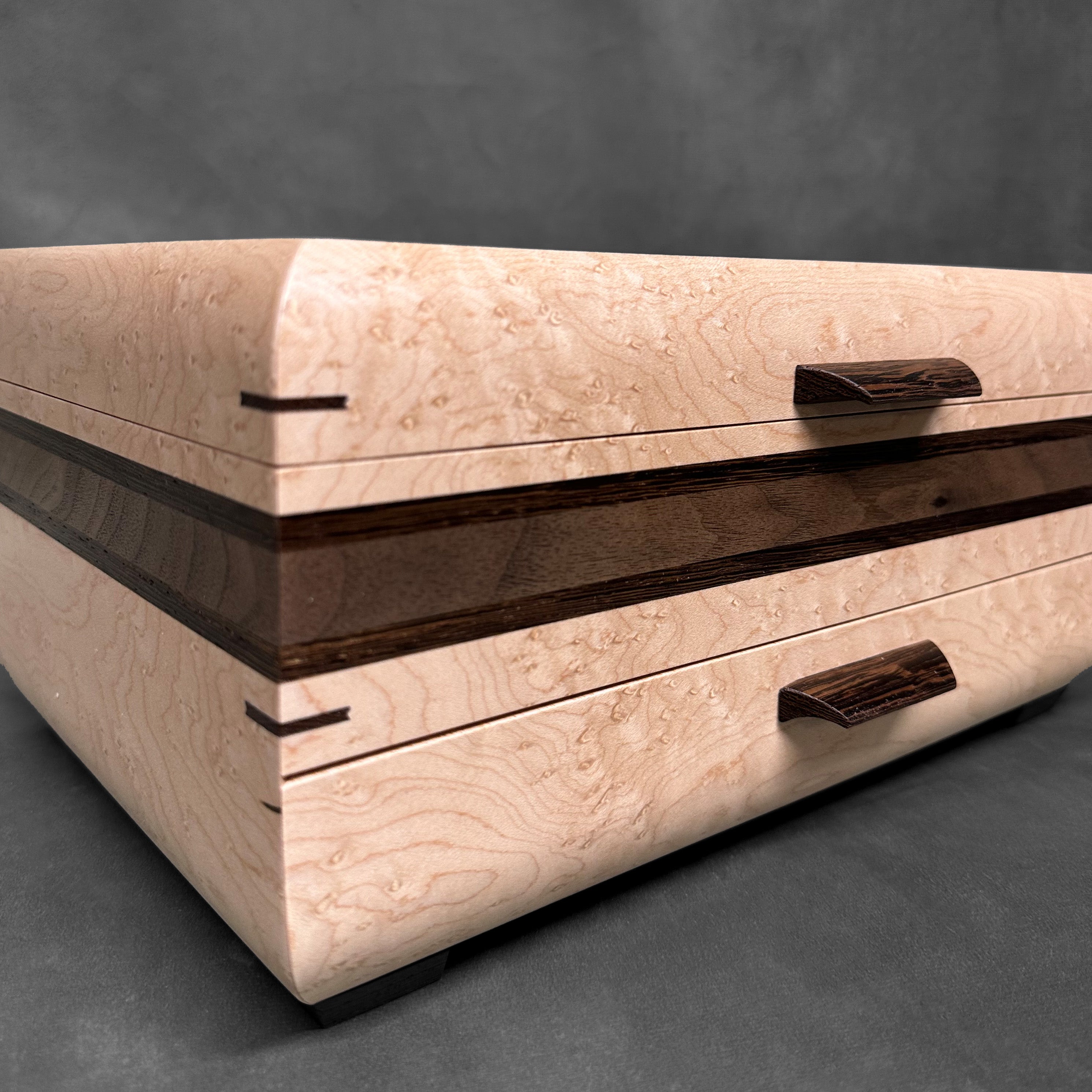 With its exquisite combination of Birdseye Maple and swirled Walnut lid, this jewelry chest is a luxurious addition to your home. The additional artistic, hand laminated striping throughout the box is made with Wenge and Walnut. Handles, feet and splines are made with Wenge. Not only does it provide ample storage space for your precious jewelry, but it also serves as a stunning decorative piece. Imagine admiring its intricate design and rich colors every day, a reminder of your impeccable taste and appreciation for quality craftsmanship. Elevate your jewelry collection with our SELECT Sophisticated Jewelry Chest and add a touch of elegance to your living space.