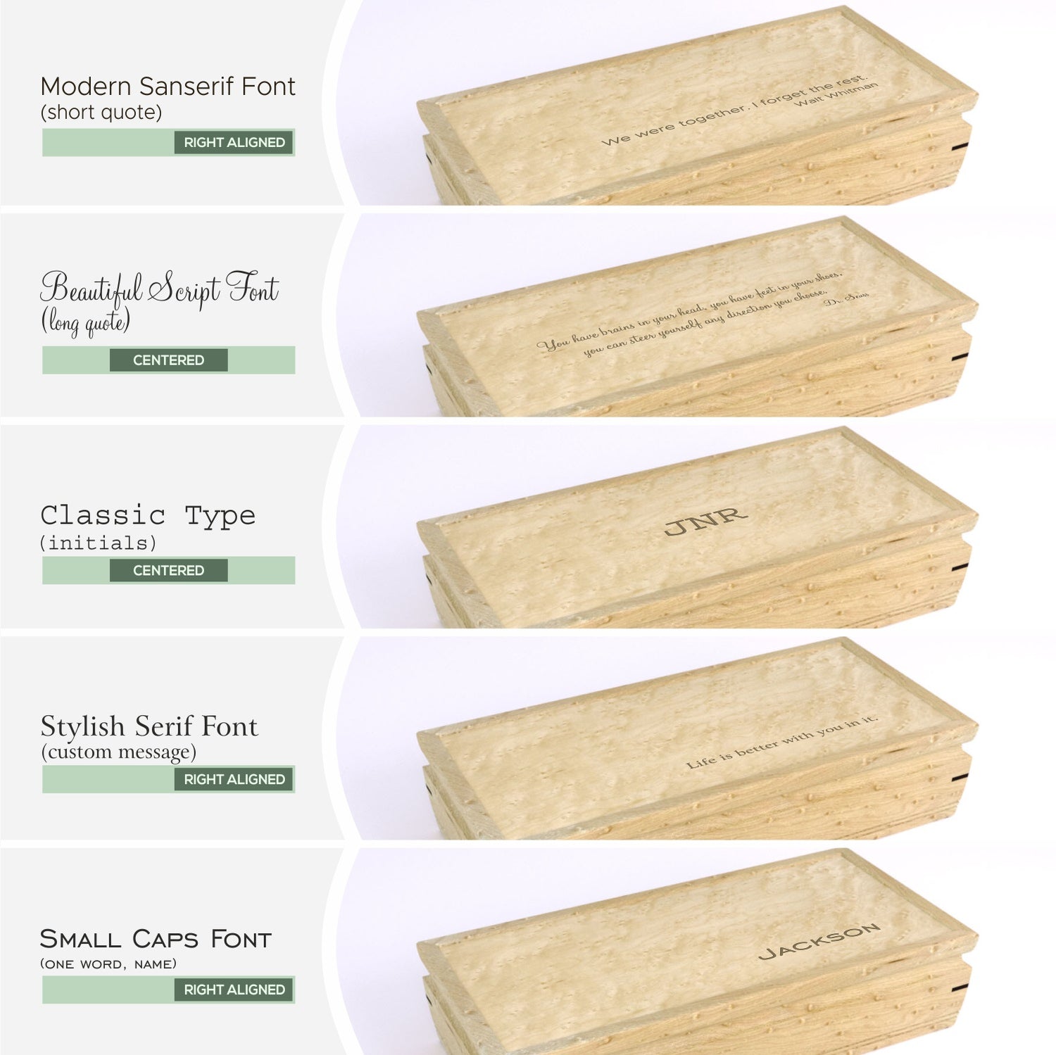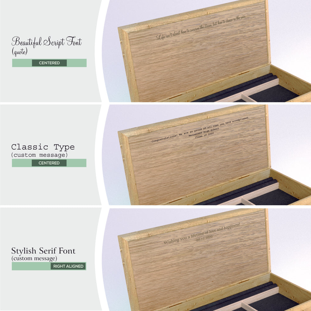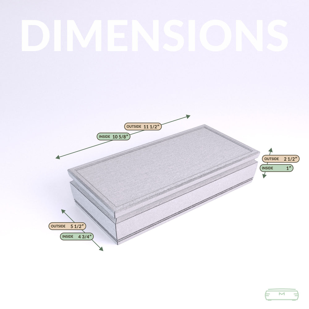 The Sentinel Jewelry Box is the most loved medium sized jewelry box. Notice the profile is slightly rounded (this is not just any “ole” box) with hand cut Wenge corner splines which add both strength and beauty to the piece. On the inside, It features wood dividers and ring roll with lined bottom interior. The inside of the lid is natural wood which can be personalized with laser engraving. This solid hardwood box with veneer hardwood lid has been sold as gifts for wedding parties, housewarmings, retirement, engagement, anniversaries and more. It’s not just used for jewelry either. The Sentinel Box can be used for desk items, letters, keepsakes and more.
