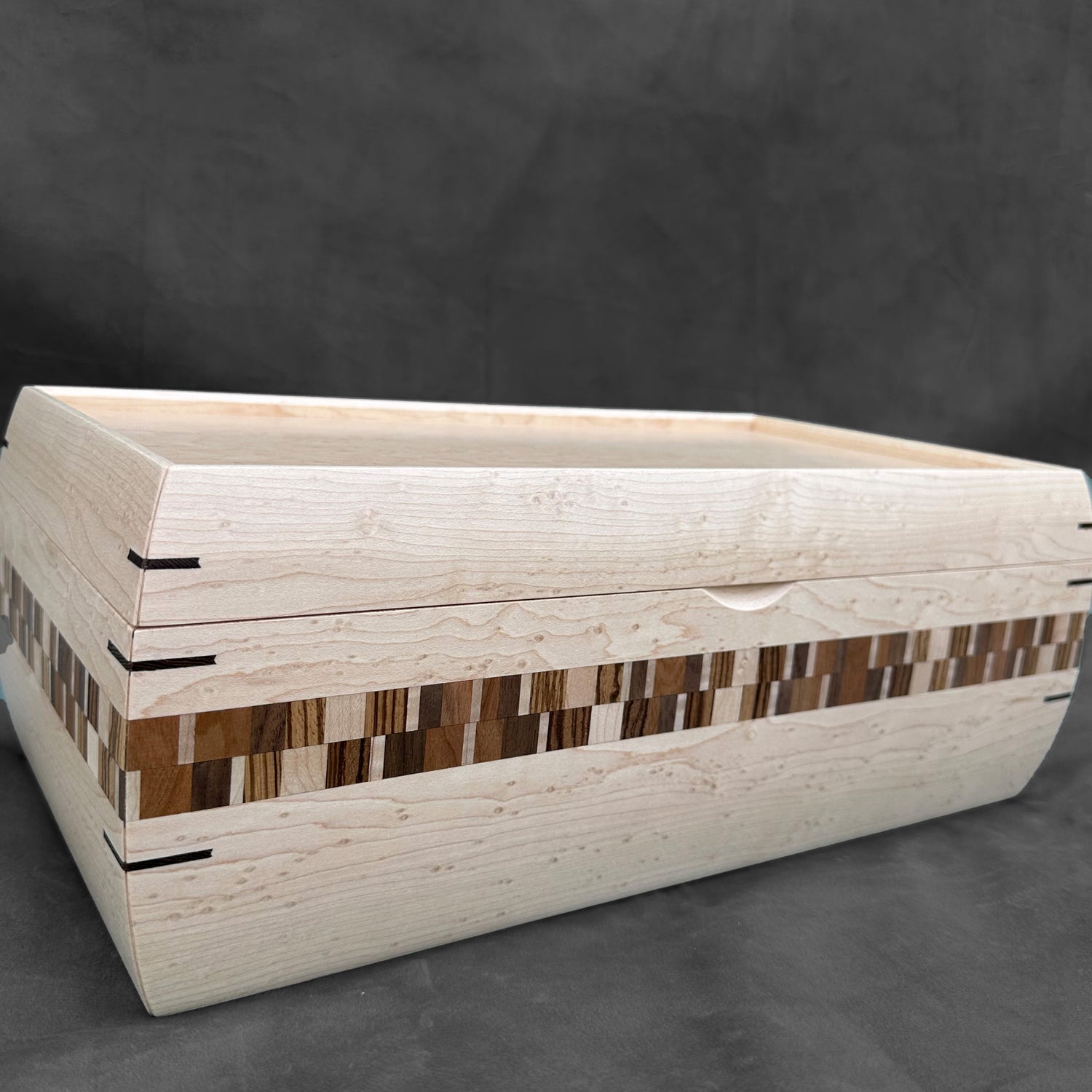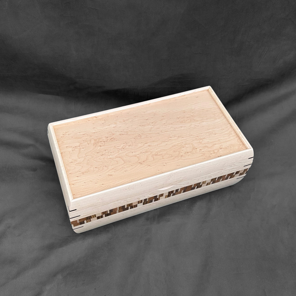 The SELECT Mini Hope Chest provides an elegant space to hold your cherished keepsakes, from photographs and letters to treasured mementos. Crafted from exquisite Birdseye maple with a matching Birdseye Maple lid, its hand laminated double check stripe showcases a refined blend of Birdseye maple, Walnut, Cherry, Curly maple, and Zebrawood. Each piece is meticulously handcrafted without stains, preserving the natural beauty of the wood. Dimensions: Exterior – 16.25" x 8.75" x 6"; Interior – 14.75" x 7.4" x 4.8".