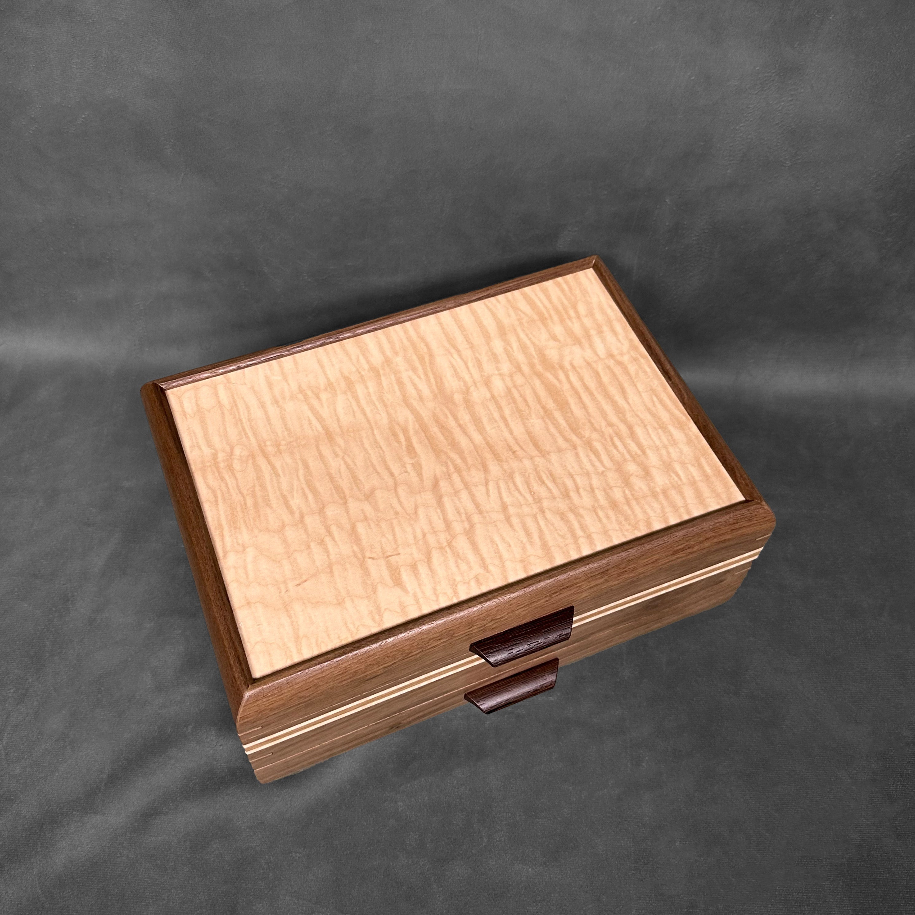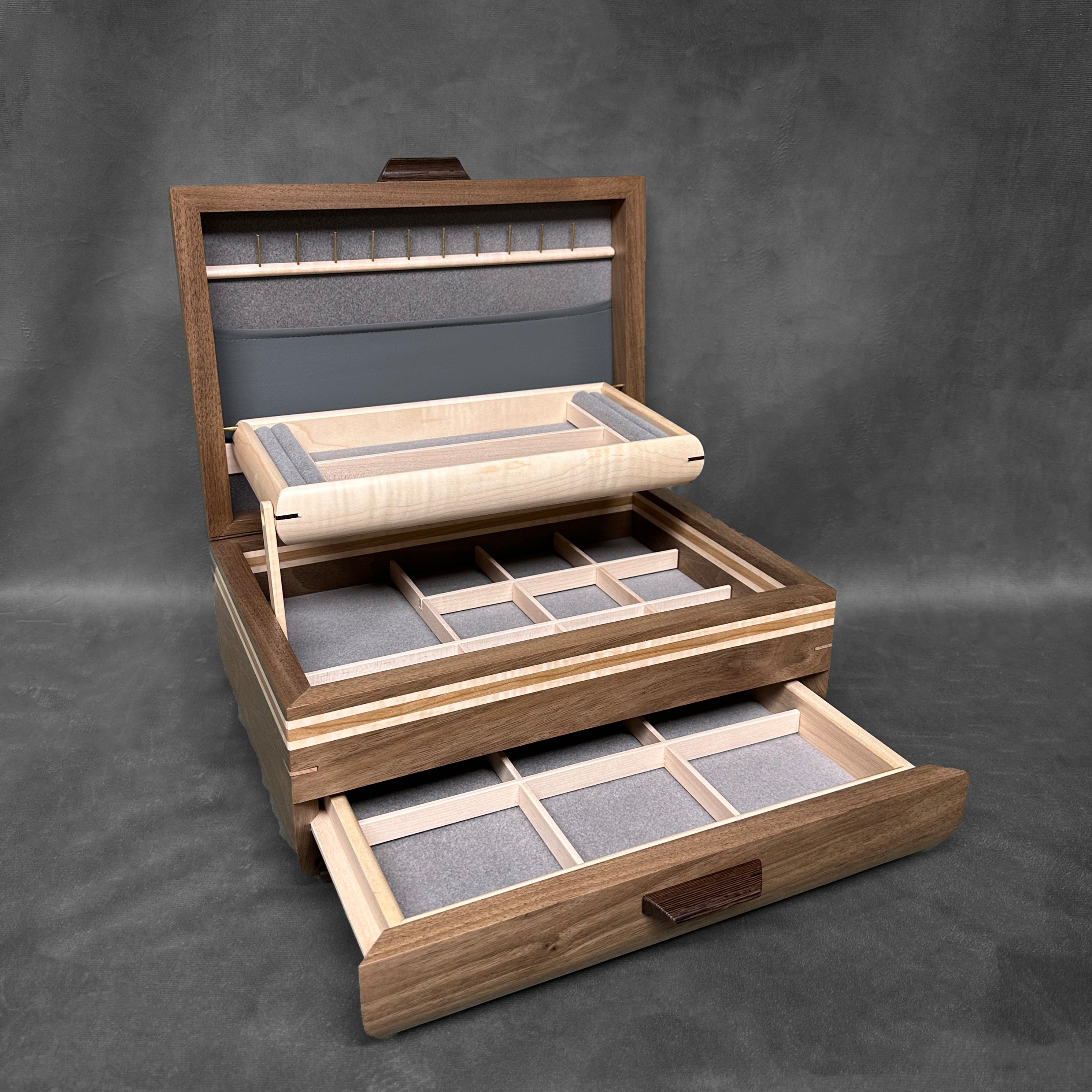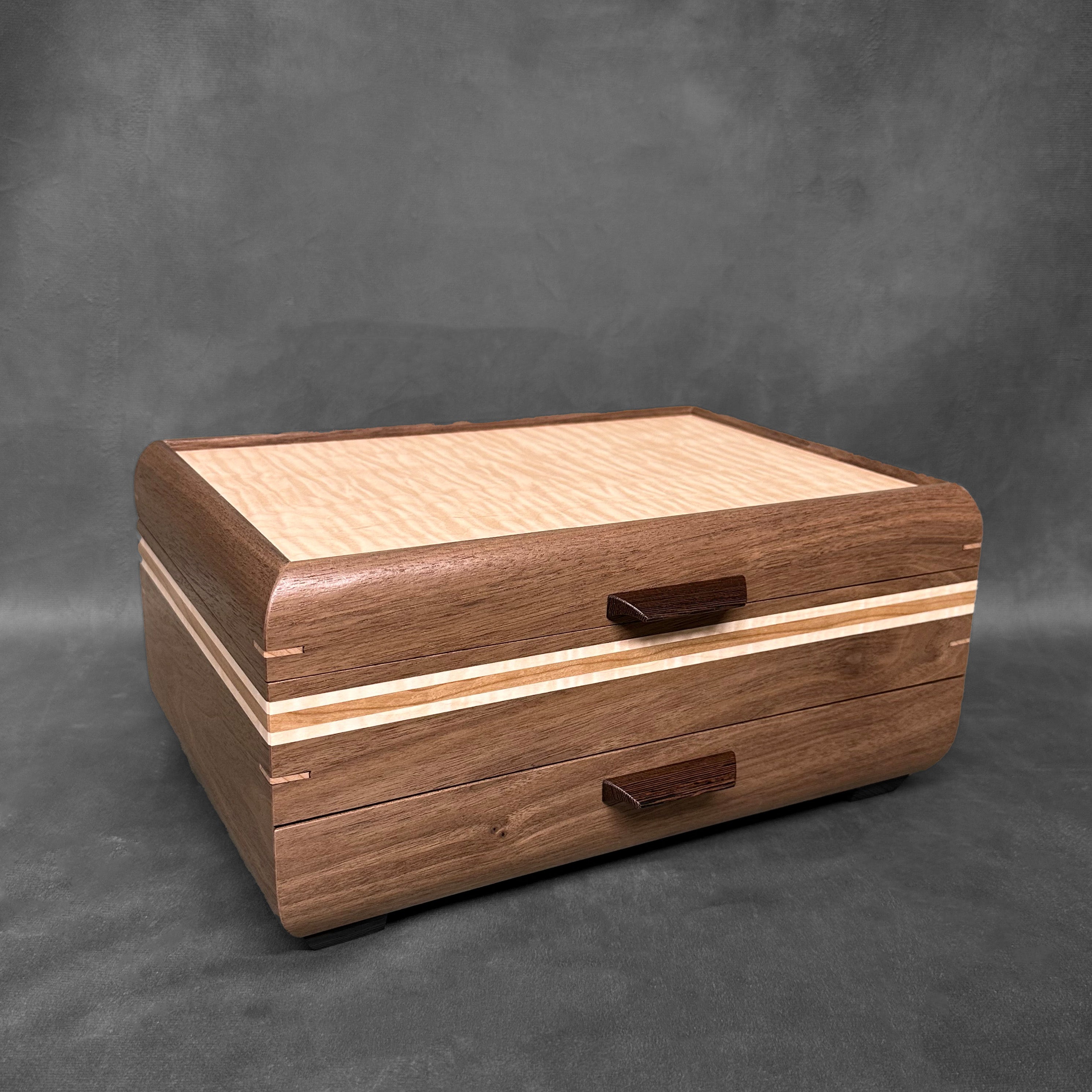With its exquisite combination of Walnut with Curly maple lid, this jewelry chest is a luxurious addition to your home. The additional artistic, hand laminated striping throughout the box is made with Cherry and Curly maple stripes. Handles and feet are made with Wenge while splines are made of Cherry. Not only does it provide ample storage space for your precious jewelry, but it also serves as a stunning decorative piece. Imagine admiring its intricate design and rich colors every day, a reminder of your impeccable taste and appreciation for quality craftsmanship. Elevate your jewelry collection with our SELECT Sophisticated Jewelry Chest and add a touch of elegance to your living space.