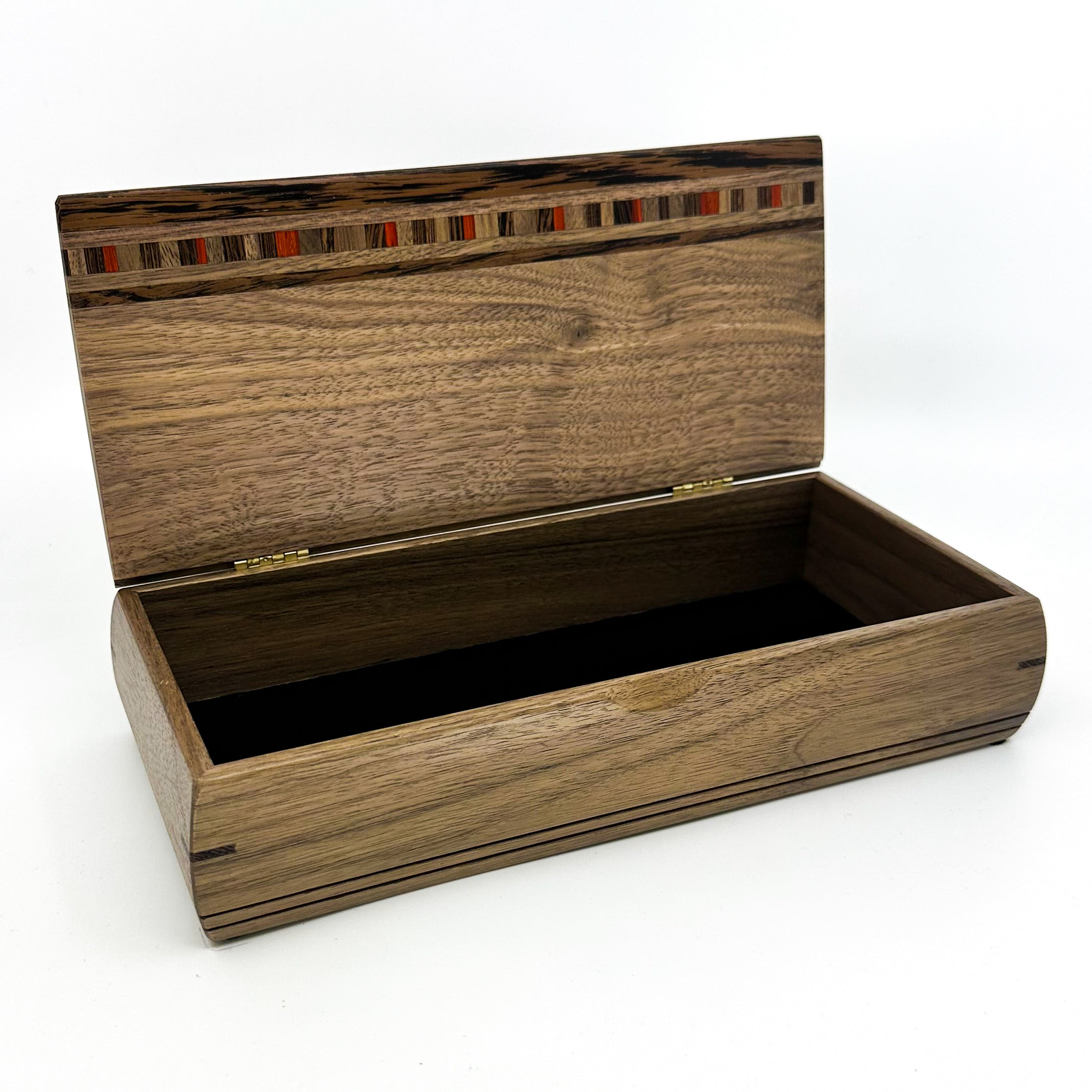 Like you, we believe your accessories deserve better than just cluttered drawers. That's why we handcrafted the Cache Box - a stylish men's valet made from solid hardwood, featuring elegant rounded edges and refined wenge splines. It's perfect for neatly storing your wallet, jewelry, glasses, loose change, or even the TV remote. Whether placed on your nightstand, coffee table, bookshelf, or desk, this box effortlessly organizes your essentials while elevating your space.